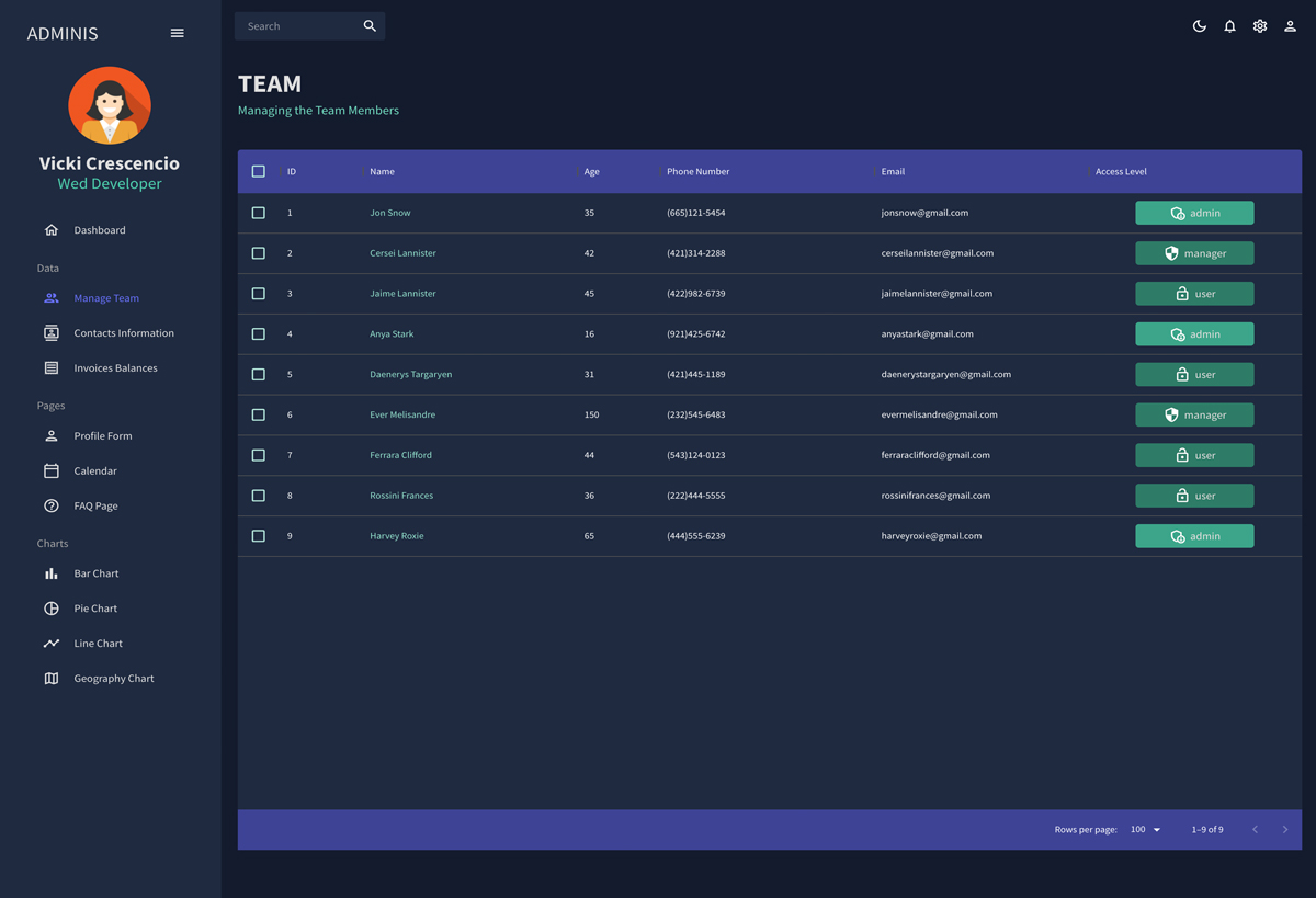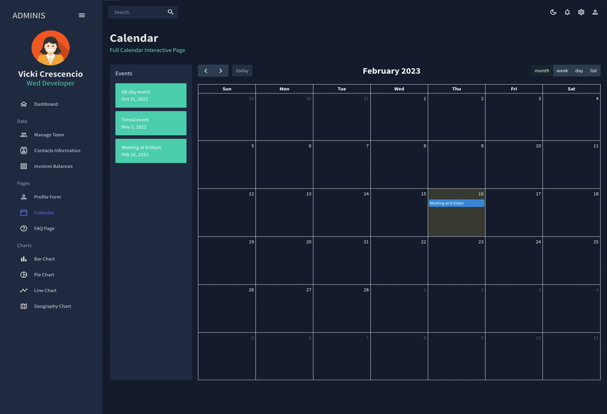 Completed React Admin Dashboard from scratch by using React, Material UI, Nivo Charts, Formik, Yup, FullCalendar, and Data Grid to build this entire application. This application consists of Light and Dark Mode, 4 different Charts, 3 different Data Table Pages, FAQ Page, Form Page, and Calendar Integration.